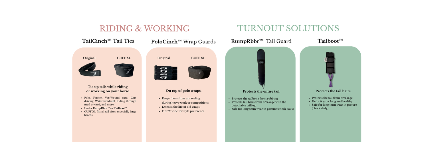 The TailCinch brand seeks to create innovative, colorful and planet-friendly solutions to many of your barn needs. We're excited to bring you our ever-expanding line of performance, grooming and fly protection products.